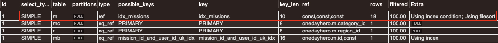 rows 칼럼과 filtered 칼럼을 통해 생성한 인덱스(idx_missions)에서 조건에 맞는 18개의 레코드만 읽고 읽은 레코드를 모두 사용하고 있음을 알 수 있다.