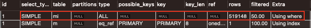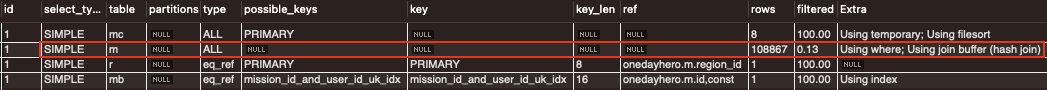 explain으로 실행계획을 살펴보면, 테이블 mi(mission_images)의 type 컬럼이 ALL인 것을 보아 풀 테이블 스캔을 하고 있다. 그리고 rows와 filtered를 통해 테이블에서 대략 50만건의 레코드를 읽고 필터링하여 50%의 레코드가 남았음을 알 수 있다.