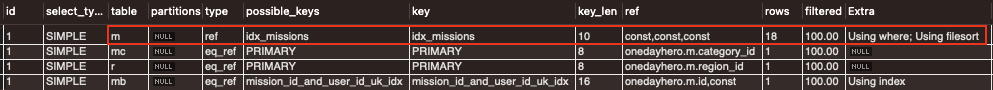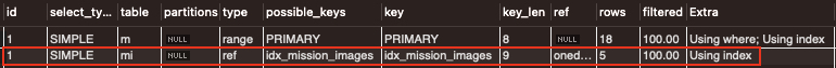테이블 mi의 key 컬럼을 통해 옵티마이저가 제대로 idx_mission_images를 사용하고 있음을 알 수 있다.