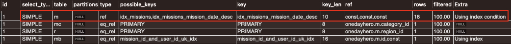 문제를 파악했으니 테이블 m(missions)에 적절한 인덱스를 생성해보자. where 절에 있는 컬럼 순서대로 인덱스를 생성해주고 다시 실행 계획을 살펴보았다.