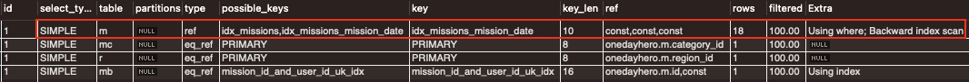 테이블 m의 extra 컬럼을 살펴보니 Using where; Backward index scan이 표시됐다. Backward index scan은 인덱스를 역순으로 읽는다는 뜻이다.