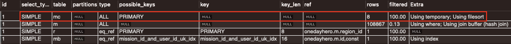 테이블 mc의 extra 컬럼을 살펴보면, Using temporary; Using filesort가 표시됬음을 알 수 있다. 이는 조인한 결과를 임시 테이블에 저장한 뒤 메모리에서 Filesort라는 정렬 작업이 처리됬음을 나타낸다. 정렬 처리 방법 중 쿼리가 실행될 때 정렬해야할 레코드가 가장 많아 느리다.