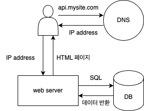 모든 컴포넌트가 단 한 대의 서버에서 실행되는 간단한 시스템을 설계하면 아래 그림과 같다. 웹 앱, 데이터베이스 캐시 등이 전부 서버 한 대에서 실행된다.