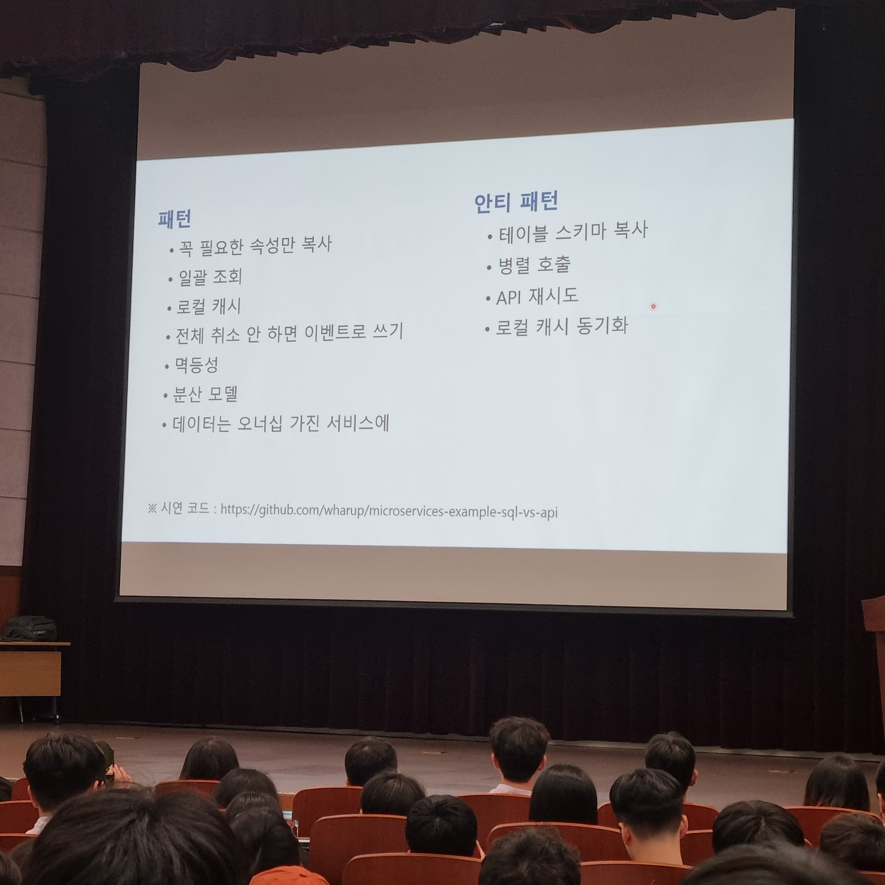 가장 인기가 많았던 세션으로 마이크로서비스 아키텍처 구축 가이드를 발표했다. 마이크로 서비스는 데이터베이스를 각각 가지고 있다. 따라서 다른 서비스의 데이터가 필요하다면 API를 통해 조회해야 한다. 이때 API로 데이터를 많이 조회하거나 조합할 때 성능이 느려진다.