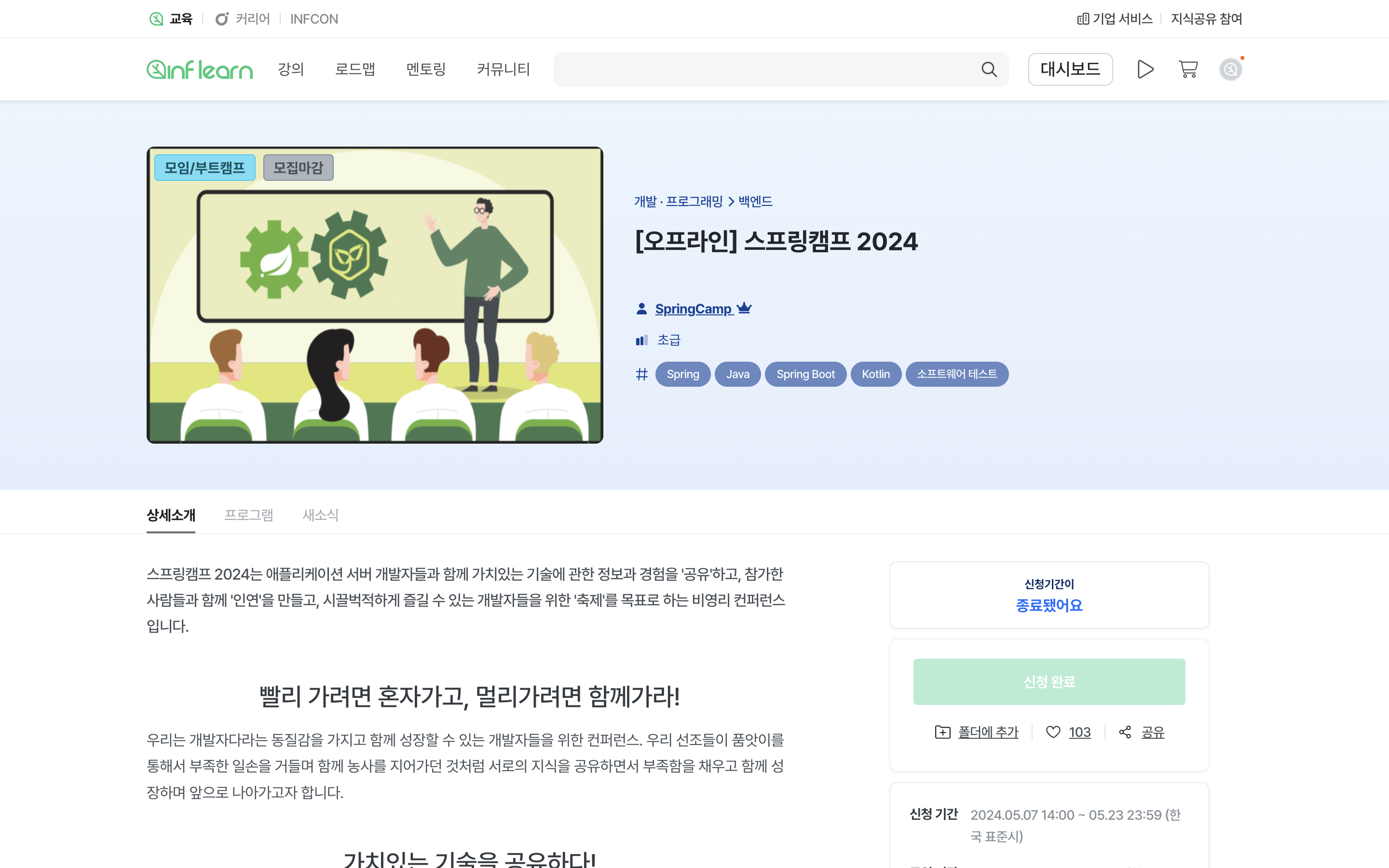 지난 5월 25일 토요일 2024 스프링 캠프에 다녀왔다. 인프런에서 참여자를 모집했는데 1분만에 마감될 정도로 치열했다. 치열했지만.. 나는 성공해서 다녀오고 이렇게 후기까지 작성하고 있다😁